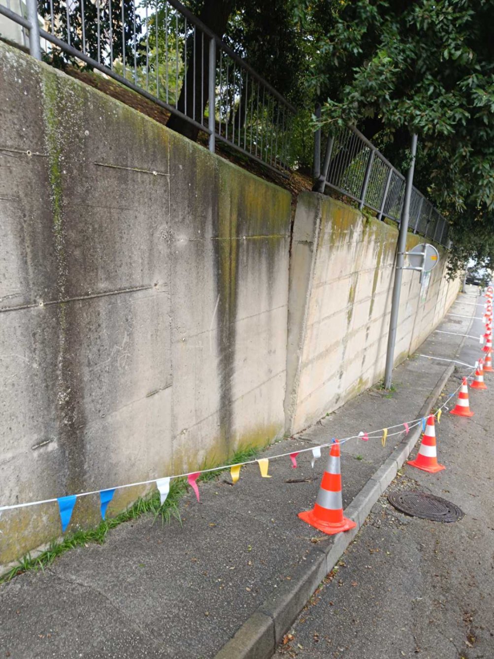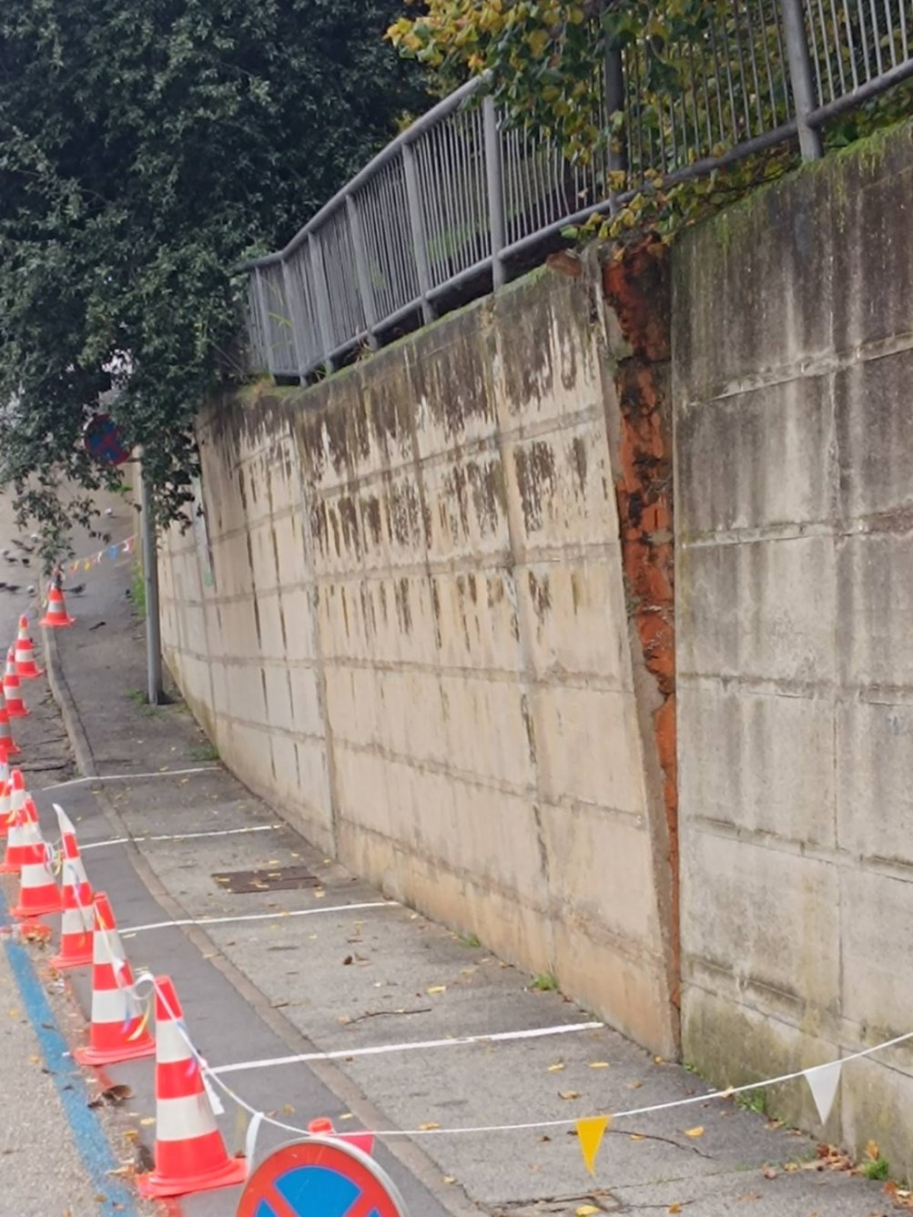 Na družbenih omrežjih se je pojavil posnetek nevarno nagnjenega trimetrskega zidu, ki grozi, da se bo zrušil. Pristojni so pod zidom postavili stožce, ki mimoidoče opozarjajo na nevarnost.