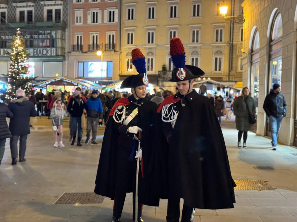 Med zlatimi lučkami hišk božičnega sejma v Trstu so se pojavili karabinjerji v slovesni uniformi, ki delujejo kot podobe, ujete med zgodovino in sedanjostjo. Njihova prisotnost med praznično okrašenimi stojnicami ustvarja poseben kontrast med sodobnim dogajanjem in zgodovinsko tradicijo.