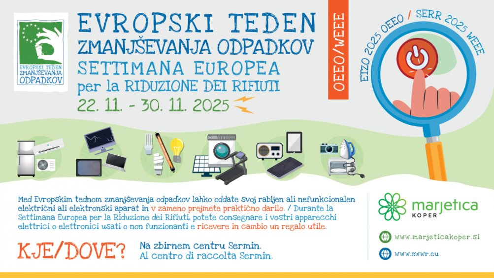 Po vsej Evropi bo med 22. in 30. novembrom 2025 potekal Evropski teden zmanjševanja odpadkov (ETZO), ki je letos v celoti posvečen odpadni električni in elektronski opremi (OEEO). Tema je vse bolj pereča – skoraj vsak izmed nas ima doma predal, v katerem se nabirajo stari telefoni, zaprašeni polnilniki, nedelujoči kuhinjski aparati ali odsluženi računalniki. V Marjetici Koper, kjer se z e-odpadki ukvarjajo že več kot desetletje, so se letos odločili za dodatno spodbudo. V času ETZO bodo vsi, ki bodo OEEO oddali v zbirnem centru Sermin, prejeli praktično darilo.