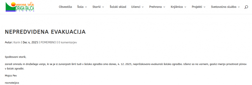 Kot je navedla na spletni strani OŠ Draga Bajca tamkajšnja ravnateljica Mojca Pev, se je iz zunanjosti širil v stavbo dražeč vonj in smrad, zato so šolsko zgradbo evakuirali.