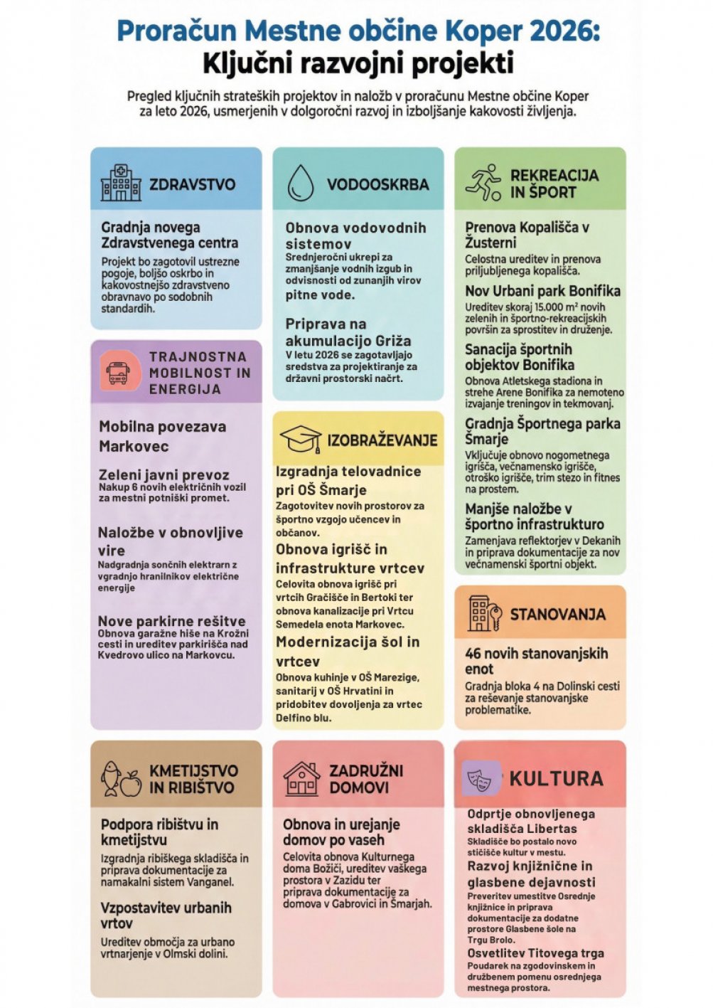 V četrtek bodo občinski svetniki Mestne občine Koper glasovali o proračunu za leto 2026, ki je zadnji v tem mandatu. Ta bo v veliki meri določil izvedbo ključnih investicij ter usmeritev razvoja občine v prihodnjih letih. Med pomembnimi projekti so zagotavljanje vodooskrbe, izgradnja zdravstvenega centra, urejanje komunalne infrastrukture ter športno-rekreativnih površin, ki se bodo posredno dotaknile vsakega občana. Poleg večjih naložb so predvideni tudi manjši projekti, ki pogosto neposredno izboljšujejo kakovost življenja tako v mestu kot na podeželju.