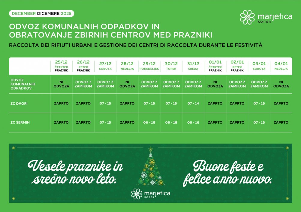 Marjetica Koper dodatno obvešča uporabnice in uporabnike, vključene v redni odvoz komunalnih odpadkov, da bo v prazničnem času, odvoz odpadkov potekal z zamikom. Prilagojeno bo tudi obratovanje obeh zbirnih centrov. Uporabnice in uporabnike naprošajo, da upoštevajo to obvestilo in ravnajo z zabojniki za odpadke, kot je navedeno v zgornji tabeli.
