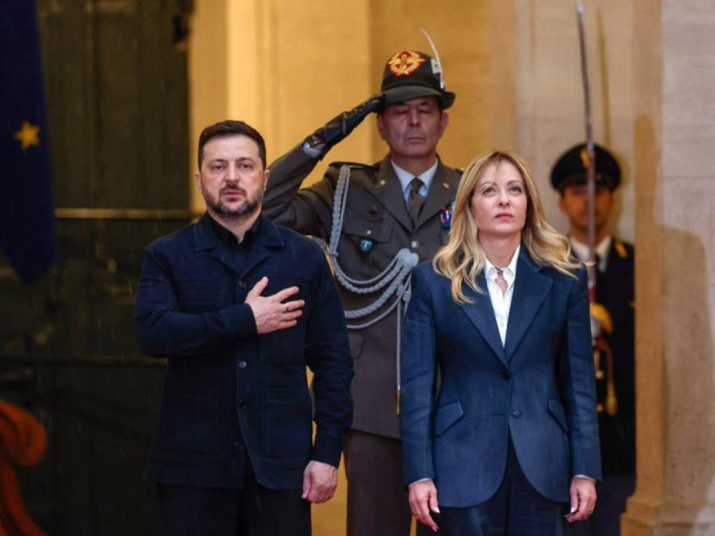 Italijanska premierka Giorgia Meloni je danes ob obisku ukrajinskega predsednika Volodmirja Zelenskega zagotovila, da sta bili Italija in Evropa vedno na strani Kijeva in da je v vojni proti Rusiji na kocki tudi varnost EU. Na srečanju sta govorila tudi o krepitvi obrambnega sodelovanja, vključno s proizvodnjo dronov.