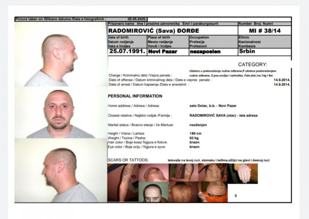 Đorđe Radomirović, obsojeni morilec, je včeraj okoli 15.45 pobegnil iz pripornega centra v Severni Mitrovici. Takoj po prijavi incidenta je policija sprožila obsežno iskalno akcijo. V iskanje so vključene vse razpoložljive policijske enote, tudi posebna enota s službenim psom (K9), medtem ko so statični kontrolni punkti postavljeni po celotnem severnem delu Kosova. Okolica zapora se intenzivno preiskuje.