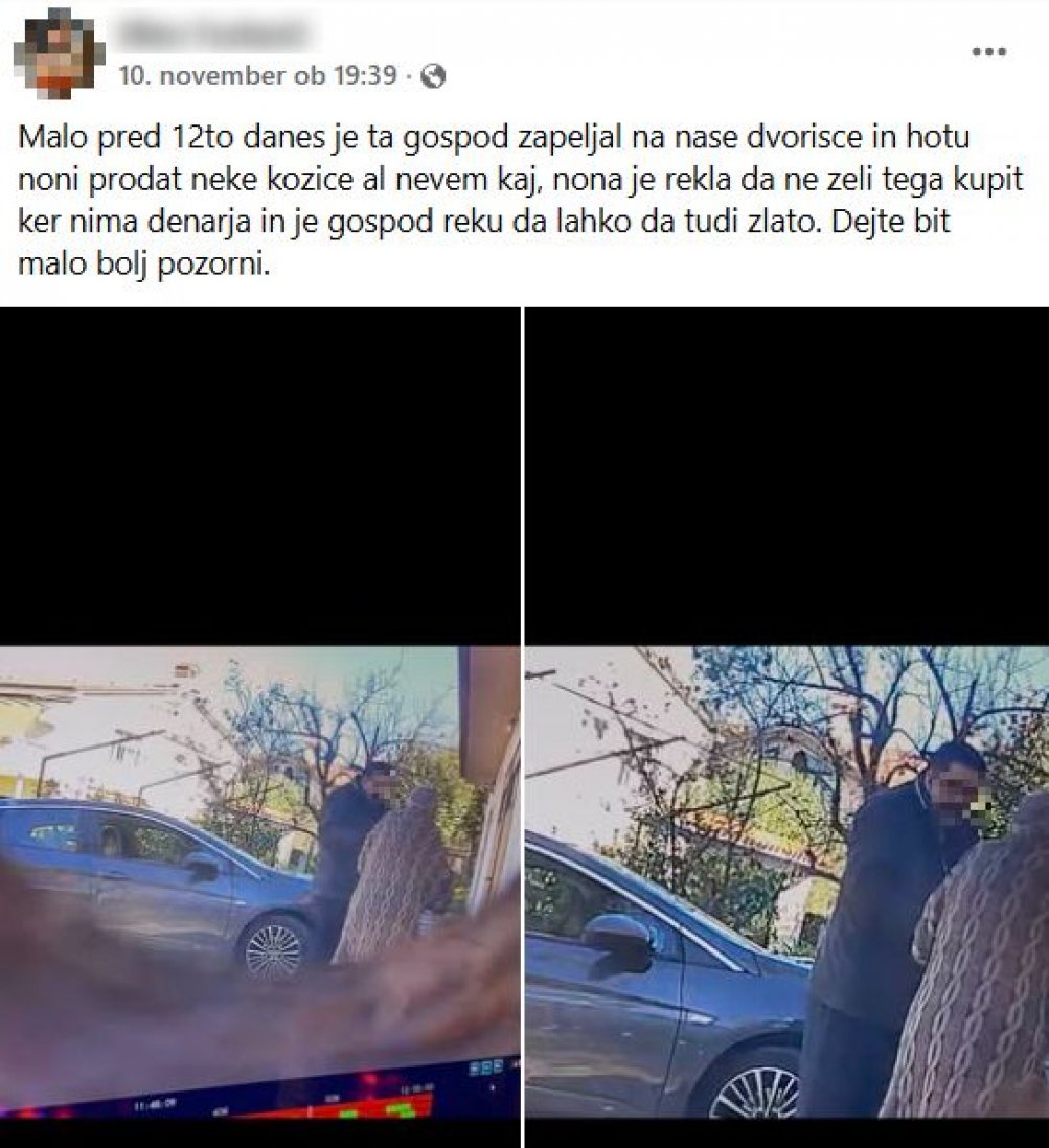 "Malo pred 12.00 danes je ta gospod zapeljal na naše dvorišče in hotel noni prodati neke kozice ali ne vem kaj. Nona je rekla, da ne želi tega kupiti, ker nima denarja. In gospod ji je rekel, da lahko da tudi zlato. Dajte biti pozorni," je v Facebook skupini, v kateri uporabniki objavljajo dogodke na območju Sežane in Krasa, pred tednom dni opozorila uporabnica. Le dan pred tem je 82-letnici pred trgovino v Kopru moški ponujal posodo. Ker mu je zaupala, jo je zapeljal domov, vstopil v njeno sobo in ukradel zlatnino. Odpeljal se je z vozilom madžarskih registrskih oznak. Sežanski policisti pozivajo prebivalce širšega območja Krasa, naj bodo previdni, saj je v zadnjem obdobju prišlo do večjega števila vlomov v stanovanjske objekte in v vozila. Do vlomov prihaja tako podnevni kot ponoči.