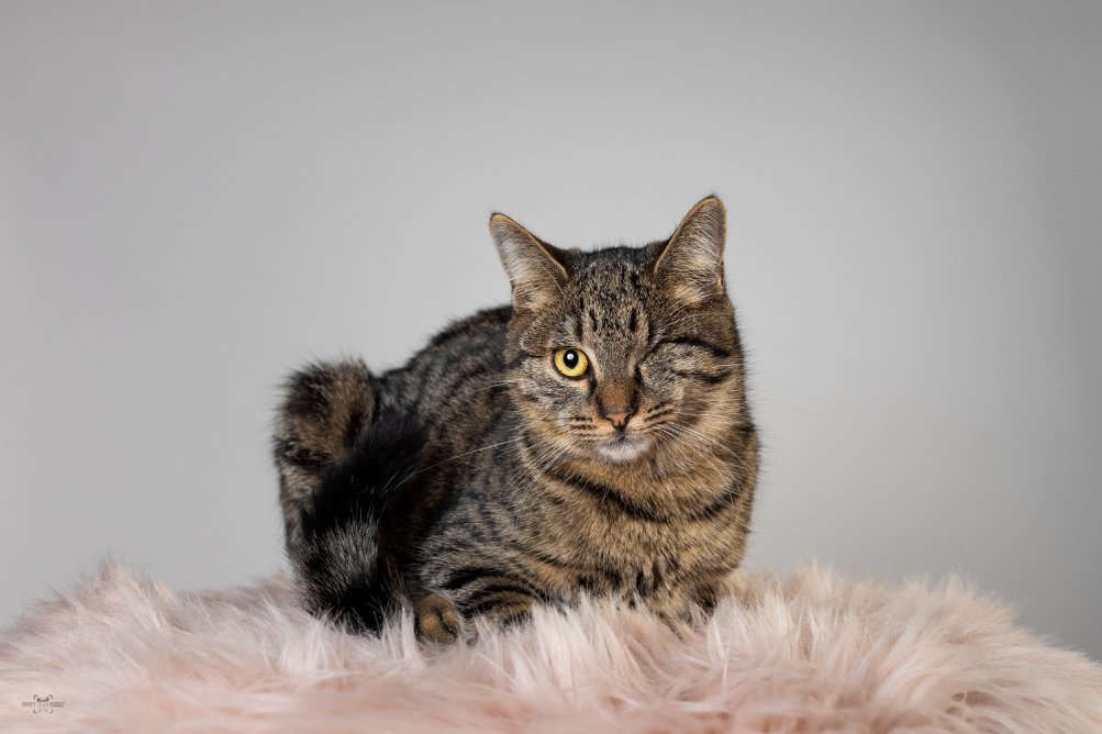 Blinky je mlad, tigrast samček star okrog leta in pol. V zavetišče je prišel s hudo poškodbo očesa, zato so mu ga žal morali kmalu odstraniti. Ker je učko izgubil kot zelo mlad, se je hitro privadil na življenje brez in se zelo dobro znajde v prostoru. Vseeno zanj iščejo izključno notranji dom. Sprva je do novih ljudi malce plašen, ko pa začuti dotik od njega ne beži, ampak se mu prepusti in sčasoma tudi lepo zaprede. Dobro se razume z drugimi muckami, je povsem nekonflikten in se rajši odmakne, če se ostali prepirajo.