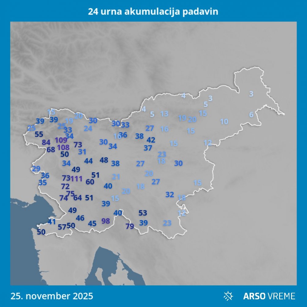 V zadnjih 24 urah je največ padavin padlo na zahodu, večinoma od 30 do 70 milimetrov padavin. Največ dežja je padlo na Voglu in v Kneških Ravnah, in sicer 109 in 108 milimetrov. Padavin je bilo precej manj na vzhodu, kjer je padlo od pet do 15 milimetrov dežja. Za jugozahod države so izdali oranžno opozorilo. Včeraj zvečer je zalilo dvorišče in glavno cesto v Hrpeljah.