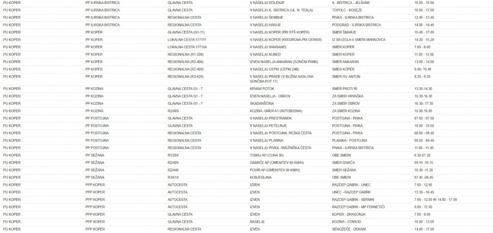 Lokacije merjenja hitrosti na območju Policijske uprave (PU) Koper