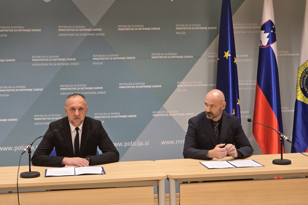 Podrobnosti kriminalistične preiskave sta predstavila (z leve) Primož Podbelšek, iz Oddelka za splošno kriminaliteto v Sektorju kriminalistične policije na Policijski upravi Ljubljana, in Robert Tekavec, vodja Oddelka za mladoletniško kriminaliteto iz Uprave kriminalistične policije na Generalni policijski upravi.