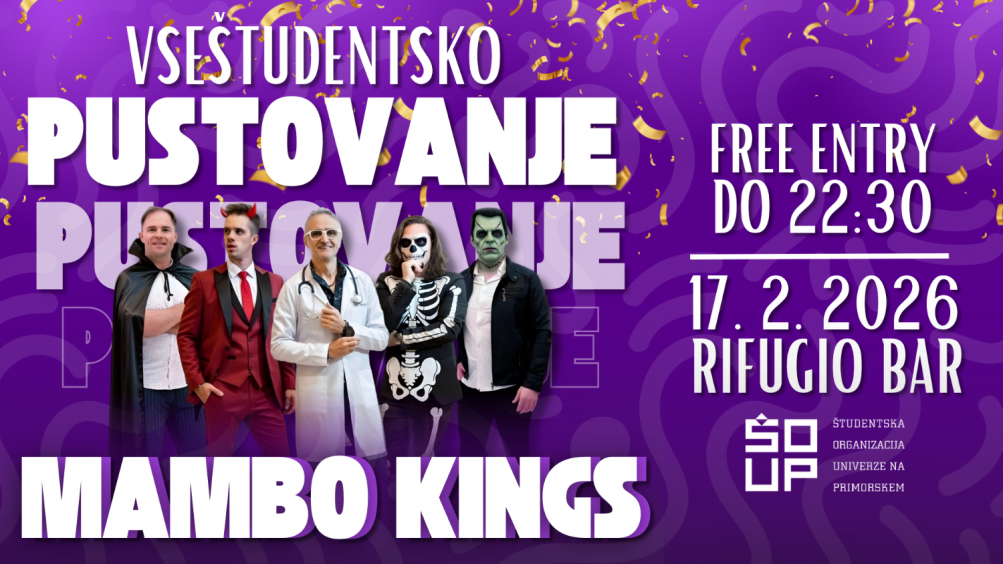 V prihajajočih tednih ŠOUP pripravlja tudi več odmevnih dogodkov. Že 17. februarja 2026 bo v Rifugio baru v Kopru potekalo vseštudentsko pustovanje. Zabava se bo začela ob 21. uri, za glasbeno vzdušje bodo poskrbeli Mambo Kings, večer pa bo nadaljeval DJ, ki bo zagotovo poskrbel za dobro vzdušje. Študente vabijo, da si nadenejo izvirne maske in se pridružijo nepozabnemu pustnemu večeru.