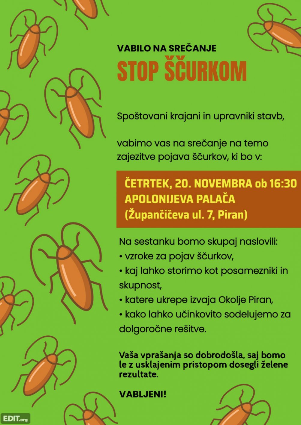 Zato vas Okolje Piran vabi na informativno srečanje s pooblaščenim strokovnjakom za dezinsekcijo, ki bo pojasnil, zakaj se ščurki pojavljajo pogosteje kot nekoč, kakšne zakonske obveznosti imajo upravniki večstanovanjskih stavb in lastniki lokalov, kako lahko nadlogo omejimo sami ter kakšen je dolgoročni načrt za zmanjšanje njihove prisotnosti.