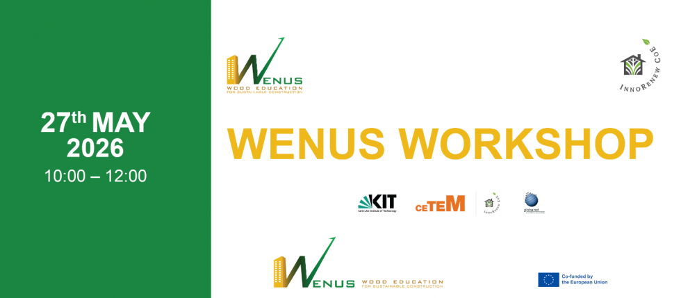 InnoRenew CoE, UP IAM organizira delavnico projekta WENUS (Wood Education for Sustainable Construction. Empowering professionals and students to build a more sustainable future through innovative and tailored training in circular wood and timber construction), ki bo potekala 27. maja 2026 v stavbi InnoRenew CoE.