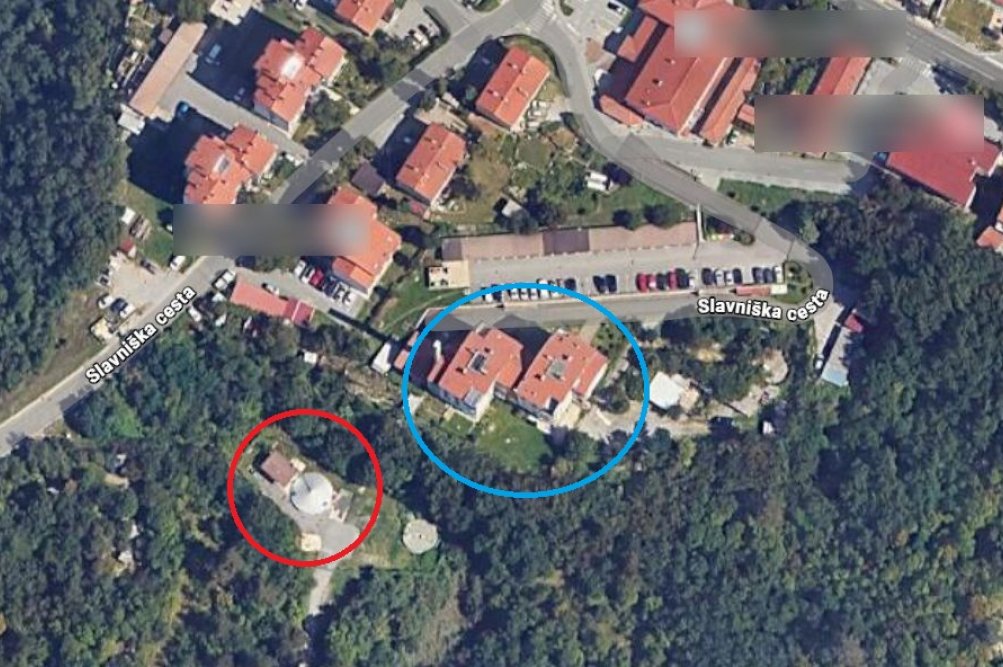 Na posnetku iz zraka je z rdečo barvo označena lokacija prečrpališča, z modro barvo pa sta označena stanovanjska bloka Slavniška cesta 5 in Slavniška cesta 3.