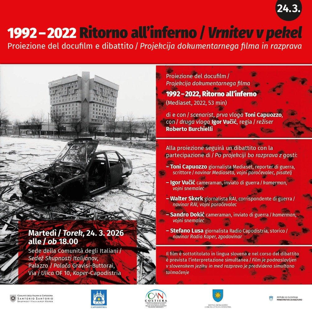 Dokumentarni film obuja eno najbolj dramatičnih poglavij novejše evropske zgodovine, kar dolgo obleganje Sarajeva, ki je trajalo od 5. aprila 1992 do 29. februarja 1996, v katerem je bilo ubitih več kot 12.000 in ranjenih več kot 50.000 ljudi, večinoma civilistov, nedvomno je. Prva javna predstavitev dokumentarnega filma režiserja Roberta Burchiellija 1992 – 2022: VRNITEV V PEKEL v Sloveniji bo v torek, 24. marca, ob 18. uri v palači Gravisi Buttorai v Kopru. Po njej bo sledila razprava z ustvarjalci in novinarji, ki so bili del teh zgodb, med katerimi bo tudi Sandro Dokić.