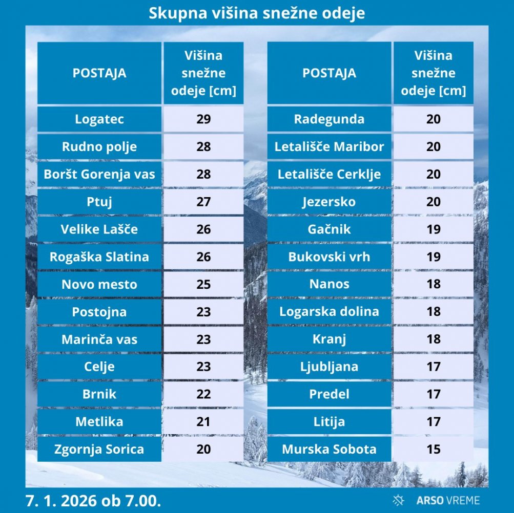 Drugače pa po Šterovih besedah sneg praktično prekriva vso državo. "Izjema so le nižji deli Primorske, tudi na Bovškem je snega bolj malo. Ampak drugod pa je recimo tudi v Murski Soboti 15 centimetrov, v Mariboru 20, na Ptuju 27, potem v Novem mestu 25, v Ljubljani 18 centimetrov," je naštel Šter z Agencije RS za okolje.
